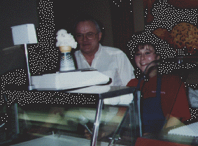 Paul Melcheck, and Tina the deli/bakery manager weigh an ice cream cone, one of the newest additions to Melcheck's. Eat ice cream while you shop!